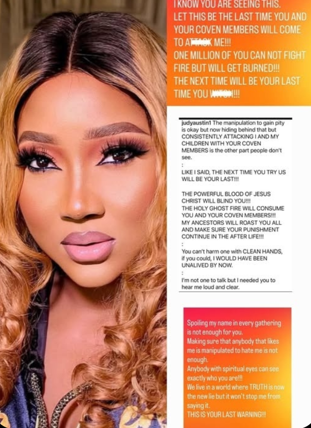 Nollywood actress Judy Austin has taken to social media to unleash a furious warning directed at critics and individuals she repeatedly referred to as a “coven,” accusing them of consistently attacking her and attempting to manipulate public opinion against her.