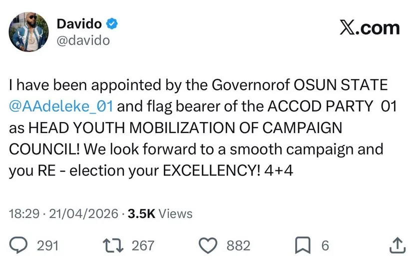 Afrobeats star Davido has announced his appointment as head of youth mobilisation for the Accord Party’s campaign council in Osun State.