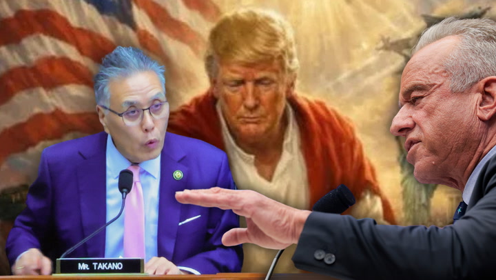 Rep. Mark Takano asked the Secretary of Health and Human Services whether he would vote to invoke the 25th Amendment if the president failed a mental fitness test, all while Trump’s controversial post depicting himself as Jesus was held up behind him.