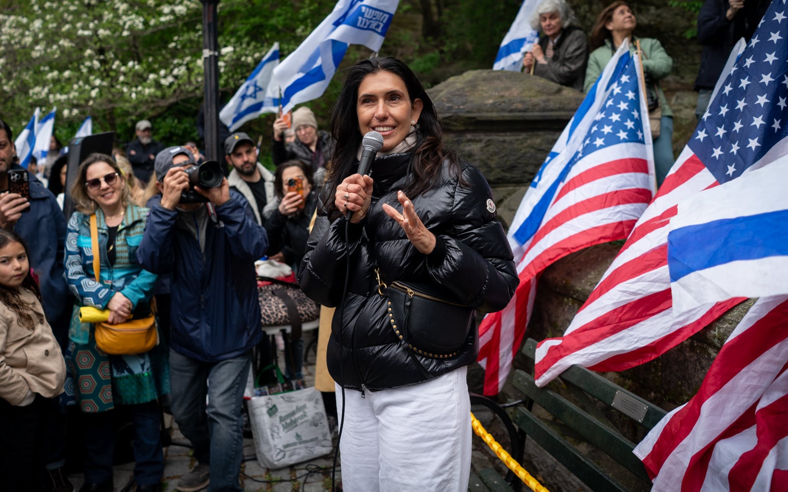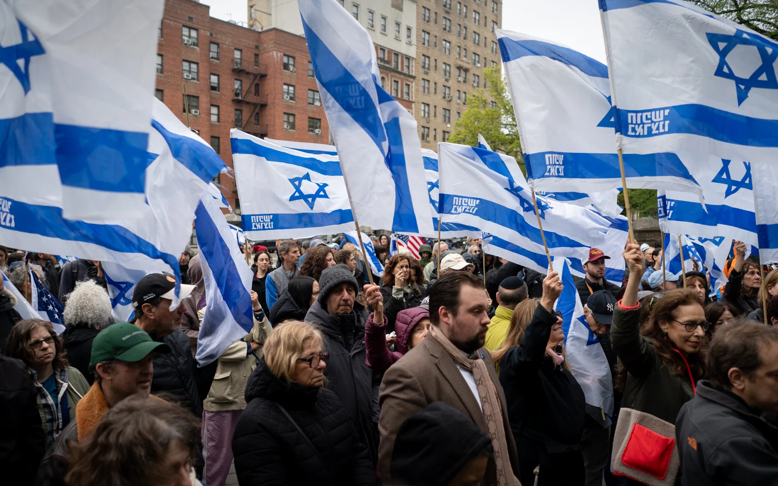 A man riding past on a CitiBike, seeing the Israeli flags, called the attendees “pieces of shit,” and another passerby shouted, “Free Palestine.”