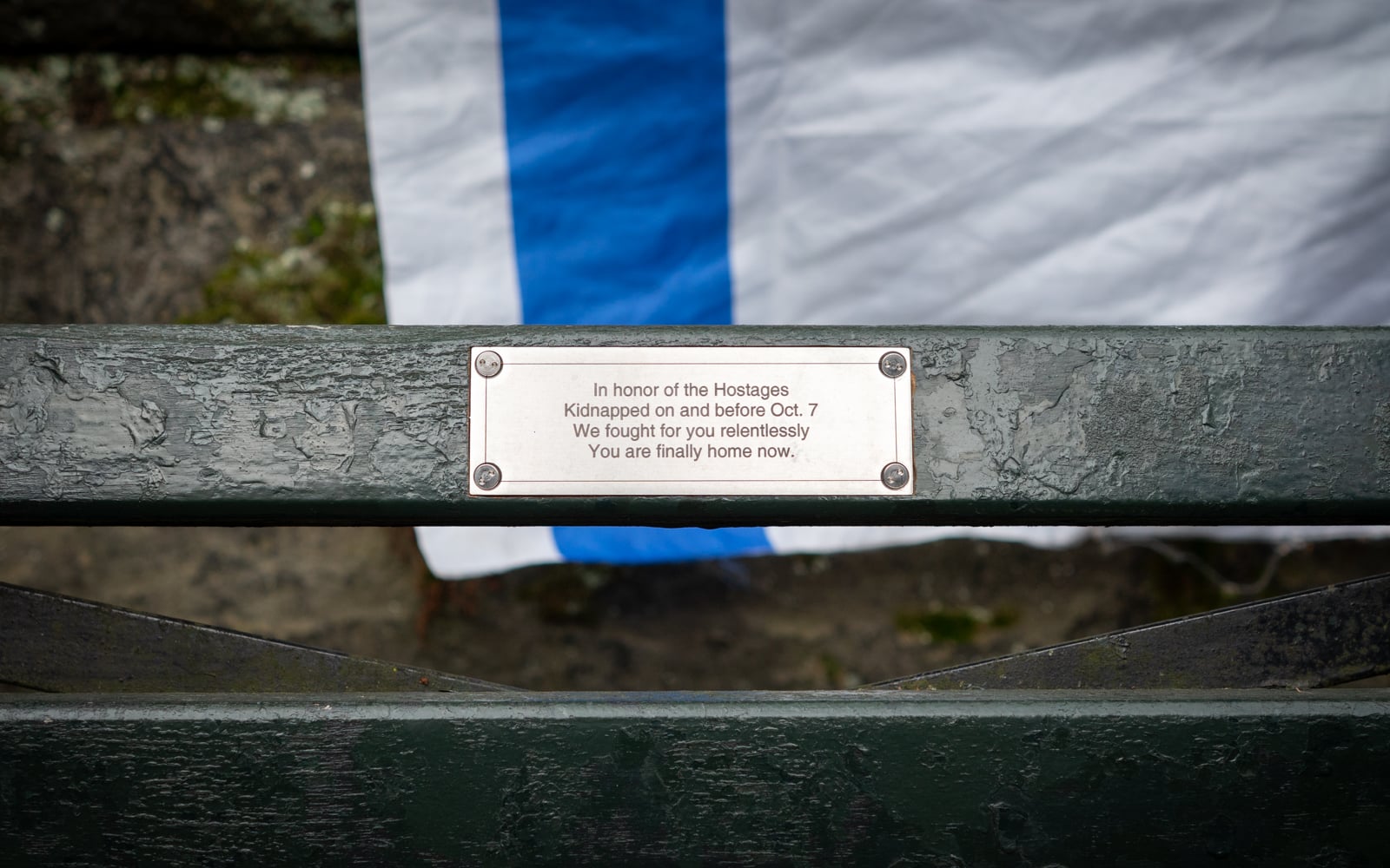 The metal placard on the bench says, “In honor of the hostages kidnapped on and before Oct. 7. We fought for you relentlessly. You are finally home now.”